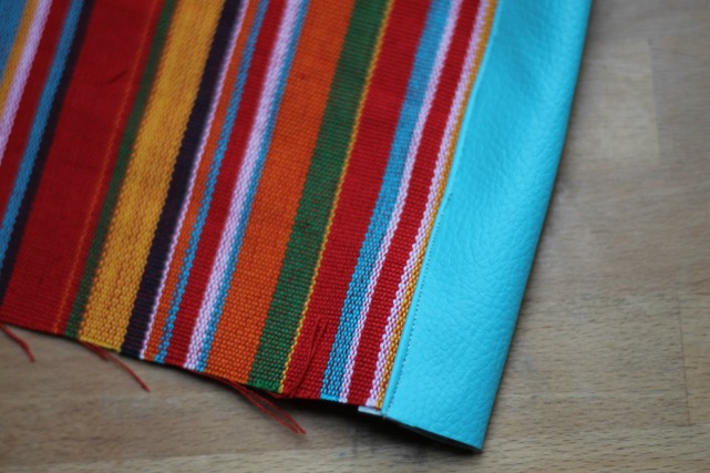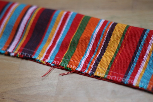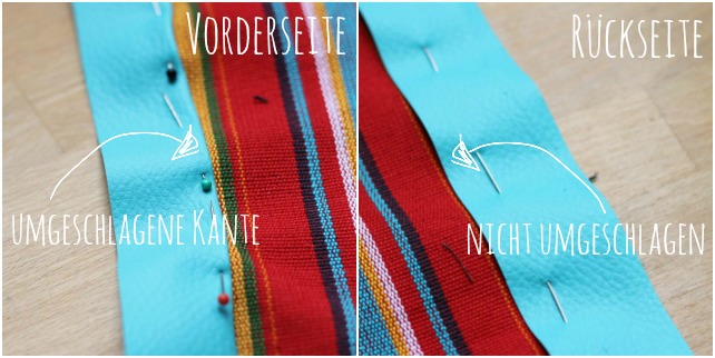Der Stoff B für die Enden wird zunächst auf einer Seite umgeschlagen (wenn ihr Baumwollstoff verwendet, ruhig die Umschlagkante bügeln, dann geht es mit dem Nähen leichter) und an das kurze Ende des Stoffs A festgesteckt und knappkantig festgenäht. Dabei wird der Stoff B auch auf der Rückseite mit festgenäht. Wenn der Stoff B wie bei mir nicht ausfranst, muss er auf der Rückseite nicht umgeschlagen werden.