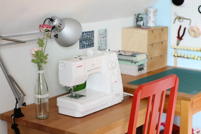Eine wirklich sehr hübsche Nähecke. Sieht so offen und übersichtlich aus. Ich wünschte, bei mir würds auch so freundlich und aufgeräumt aussehen.