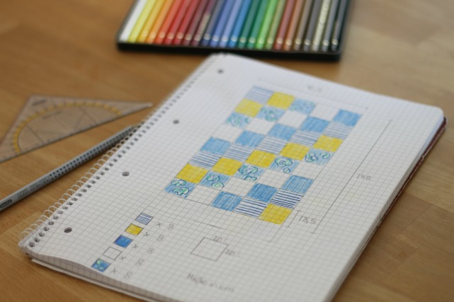 » Überlege dir (immer!) zuerst, wie groß die Decke ungefähr werden soll und welches „Muster“ (Anordnung der Quadrate) du haben möchtest. Das ist später für die weitere Planung wichtig.