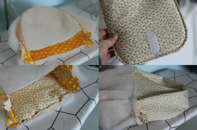 | 1. Der Außenstoff mit Vlies und Futter in Form genäht. 2. Die Lasche mit Klettverschluss. 3. die Einzelteile werden angeheftet. 4. Der Innenstoff wird zugefügt und alles vernäht. |