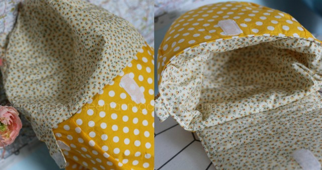 | 1. Der Außenstoff mit Vlies und Futter in Form genäht. 2. Die Lasche mit Klettverschluss. 3. die Einzelteile werden angeheftet. 4. Der Innenstoff wird zugefügt und alles vernäht. |