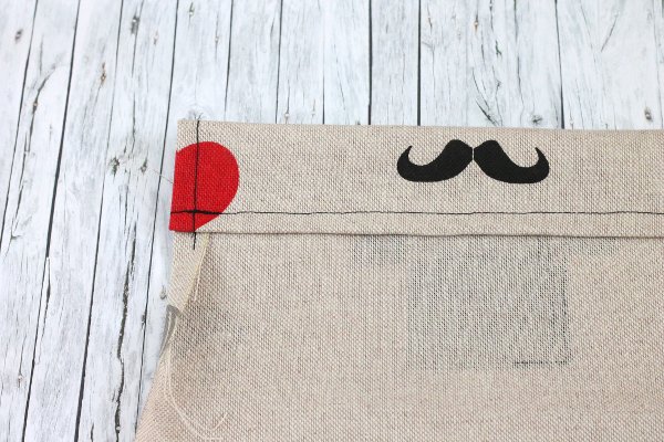 zunächst an den langen Seiten, oben und unten den Stoff 1 cm nach innen. Das