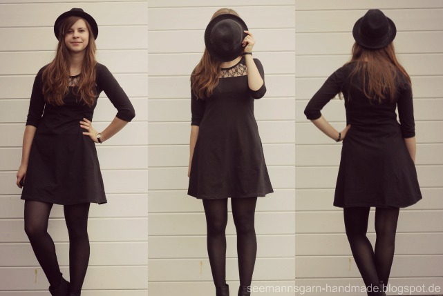 Aber nicht irgendein schwarzes Kleid – nein – kein geringeres als den Schnitt „Toni“, der auch meinem Ankerkleid zu Grunde liegen durfte. Ich liebe dieses Kleid, denn es liegt toll am Körper und hat einen legeren Schnitt. Dieses Mal wollte ich allerdings eine schlichtere Version nähen. Ein einfarbiges, schwarzes Kleid, quasi ein Allrounder für jede Gelegenheit. Ich liebe es, schwarz zu tragen – meine Herbstfarbe! Aber da ich ein schwarzes Jerseykleid dann doch zu langweilig fand, habe ich etwas Spitzenstoff eingearbeitet. Und mit dem Ergebnis bin ich so super zufrieden! Für meine ersten Versuche mit Spitzenstoff muss ich mir dann doch mal auf die Schulter klopfen. 🙂